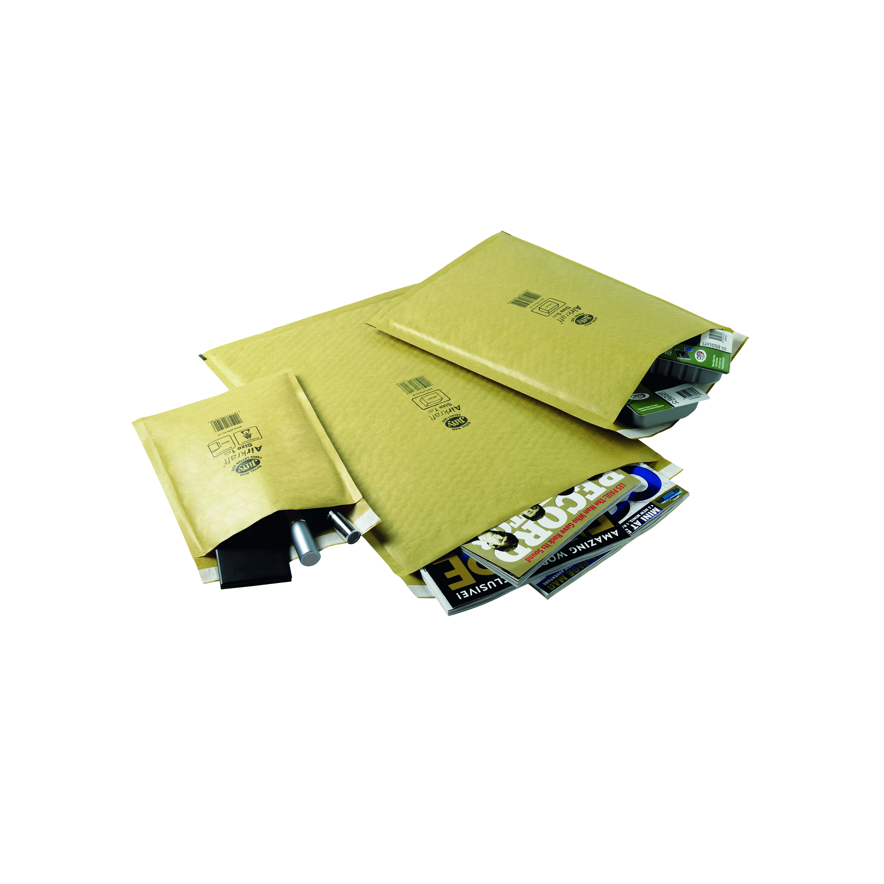 These Jiffy Airkraft padded mailers are lightweight and economical to help keep postage costs down. The mailers feature a fully laminated lining of Astro SupraBubble for extra strength and puncture resistance, and a strong self-seal closure. Ideal for mailing delicate or fragile items, the mailers are also impact resistant for protection during transit. These size 7 mailers measure 340 x 445mm. This pack contains 100 gold mailers. The bubble that inner lines the mailers is produced using a minimum of 30% recycled content.
